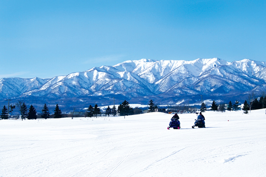 北海道の広大な自然の中、壮大なピンネシリの山々を眼前に広がる景色を楽しむ。